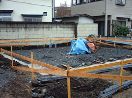 遣り方 建物GL設定のためのBM(ベンチマーク)を設けて基礎高さの基準を設定しました。更に、建物位置の墨出しを行い水糸を張りました。これで遣り方完了です。週明けから根切りが始まるので、基礎の打合せを行い配筋と今後の工程の確認をしました。 |