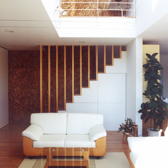 | リビングに合せた格子デザインの階段。階段下は収納になっている。 |