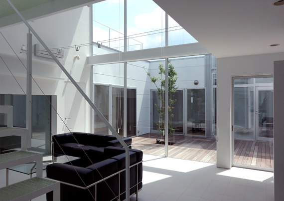 | 敷地は閑静な住宅街の中にあり、南側と西側に市道が通る角地です。道路側からの視線とプライバシー確保を考慮し、建物は外側に閉じ内側に開いた空間構成にしました。建物形態はコートを介した東西完全分離型の2世帯コートハウスです。 1階部分を「城壁」のような白い大壁で覆いできるだけ最小限の開口部とし、その囲い込んだ中央部分に中庭(コート)を設けました。コートの廻りにシルバーに輝く直方体の3つの個室ユニットを設け、そのユニット間を全面ガラスで囲ったガラス箱のアトリウムを挿入しました。コートの西側ゾーンは子世帯住居、東側ゾーンは親世帯住居としてそれぞれ個別独立した構成となっています。 また、建物全体としては両世帯間がコートを中間領域として介在させ、お互いのコミュニケーションを形成することがテーマの一つです。西側ゾーンは吹抜けで2層になったガラス張り空間のリビング(アトリウム)を生活の中心として構成しました。ガラス張りのアトリウムはコートと連続することで屋外的な明るさと開放感を備えたトポロジカルな領域として認識されます。 また、ダイニングキッチンとリビングガレージが接続することで空間に“場所性”が発生します。東側ゾーンも吹抜けのガラスで囲われたリビングとコートに面したプライベートルームを中心に構成しました。リビングには透過性のあるラセン階段を設け、ロフト風のプライベートルームにアクセスできます。 |