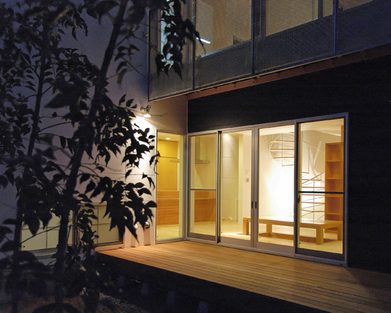 | 和室からダイニングと玄関ホールを見る。ライトアップされたラセン階段はオブジェに見える。 | |||||||||||||||||||||||||||||||||||||||||||||||||||